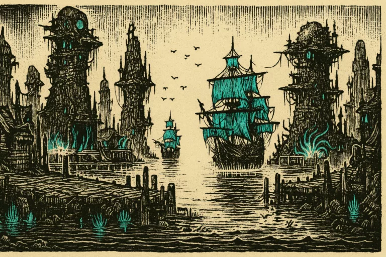 Chapelune is an island steeped in eerie beauty. Its alabaster cliffs rise sharply from the sea, crowned by a crumbling chapel whose spire pierces the heavens. The chapel is a marvel of forgotten craft, adorned with stained glass windows that depict celestial and alien figures in cryptic poses. Though the building has succumbed to time, the glass remains flawless, casting fractured light across the silver-leafed forest below.